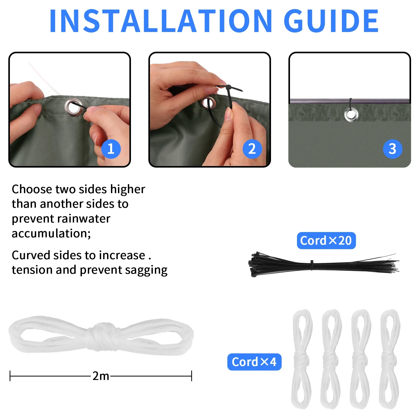 Easy to install: The aluminum eyelets sewn every 50 cm at the top and bottom ensure maximum stability. You can use ropes and installation kits to install them easily and safely. With this simple installation method, you can install shade sails on walls, fences, pillars and even trees.