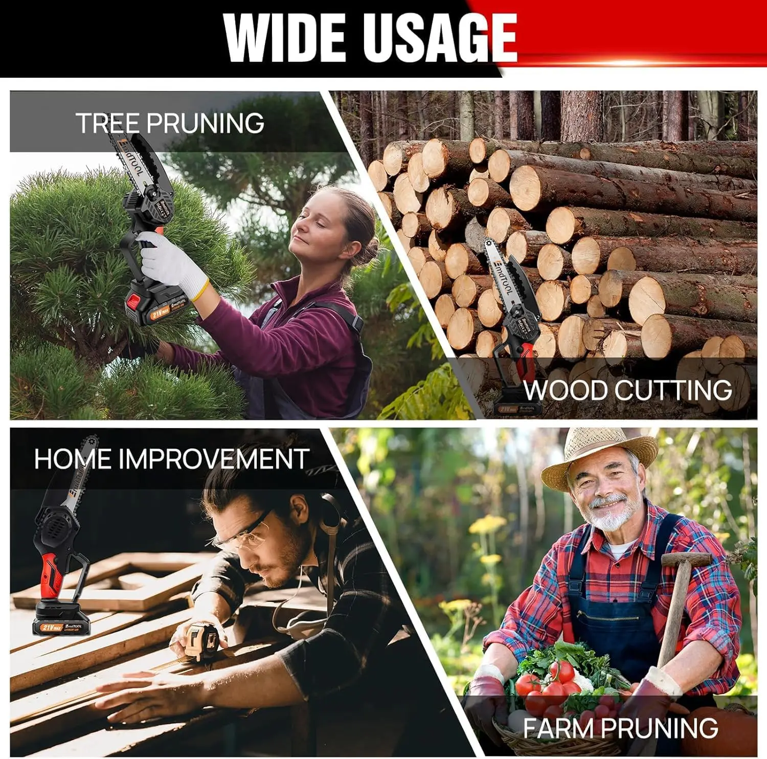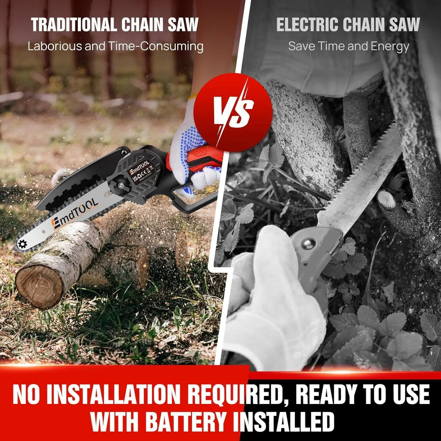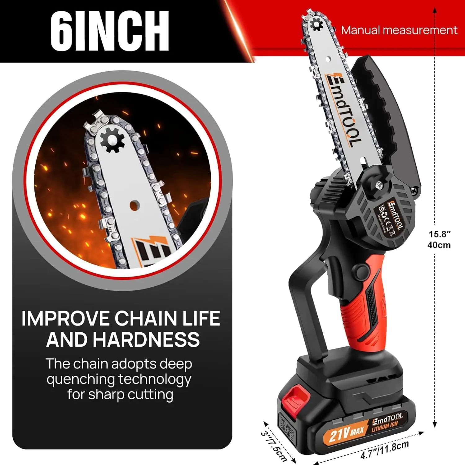 🔥【Fully Upgraded 6 Inch Mini Chainsaw】Powerful brushless copper motor provides the chain saw with longer run-time,more torque and power.20ft/sec ultra-high chain speed and the output power of 5000w takes only about 15 seconds to cut a 6" diameter log.