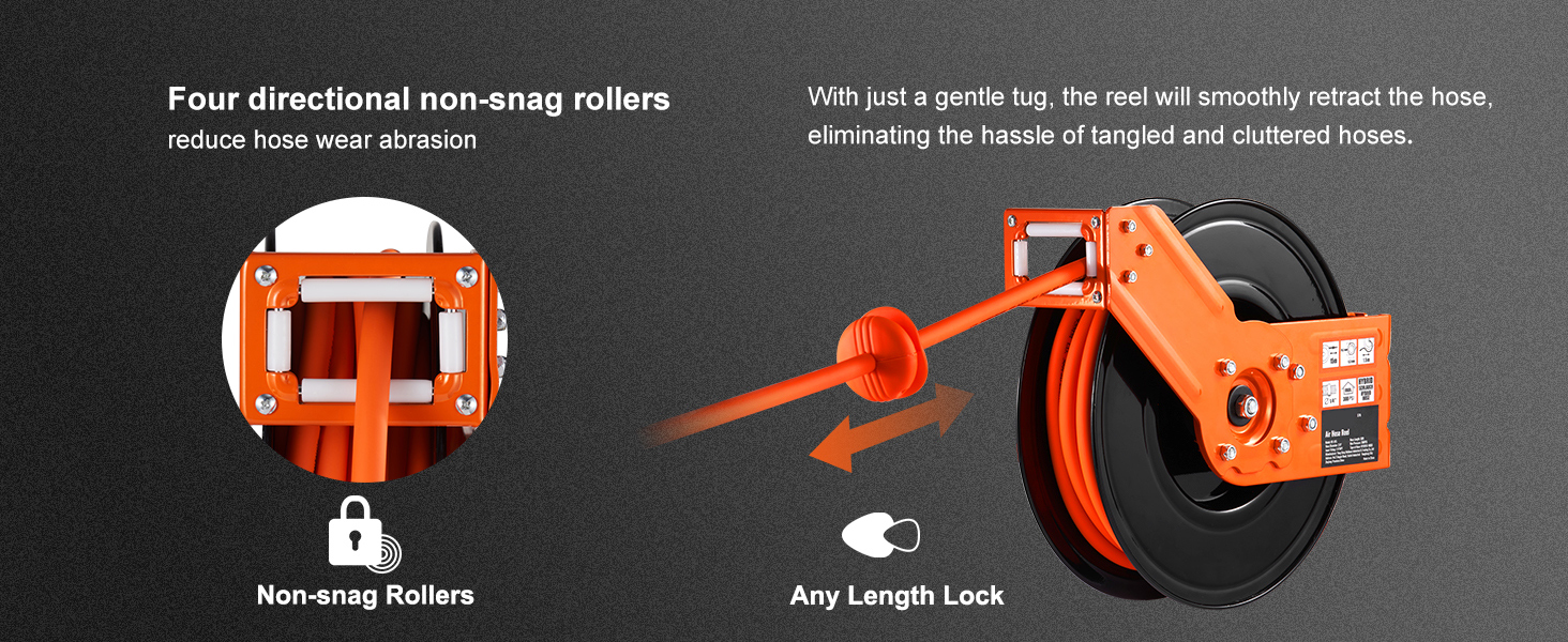 Innovative Auto-Rewind Mechanism:The SucceBuy auto-rewind feature simplifies hose management. A gentle tug initiates a smooth retraction, while four non-snag rollers minimize wear. Plus, you can easily adjust the stopper to secure the hose at your preferred length.