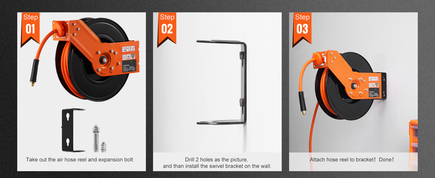 Flexible Mounting Options:Equipped with a 180° swivel bracket, the heavy-duty steel reel can be mounted on ceilings, walls, or floors. This design allows for quick and easy connections to your air compressor, perfect for your workshop, garage, or basement.