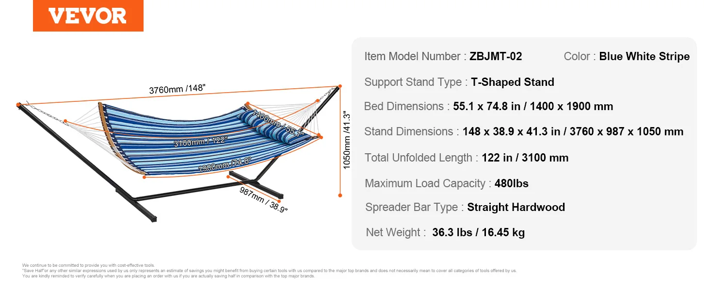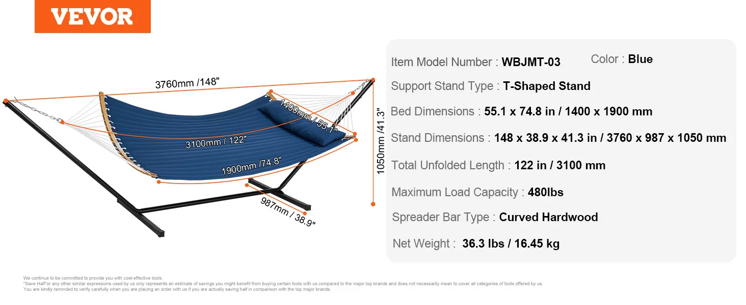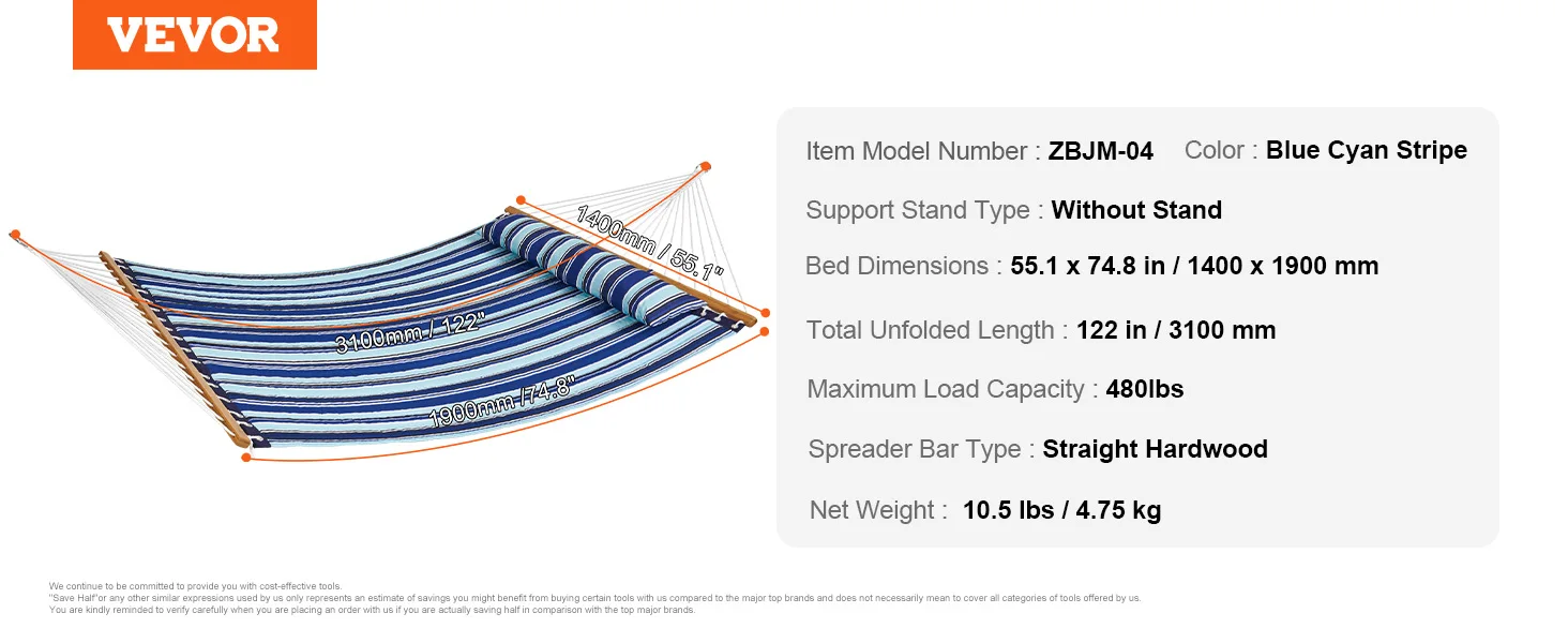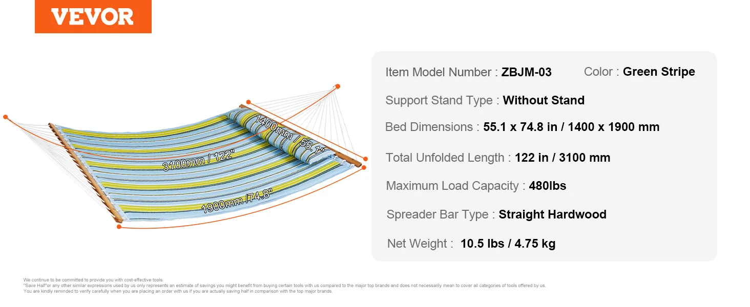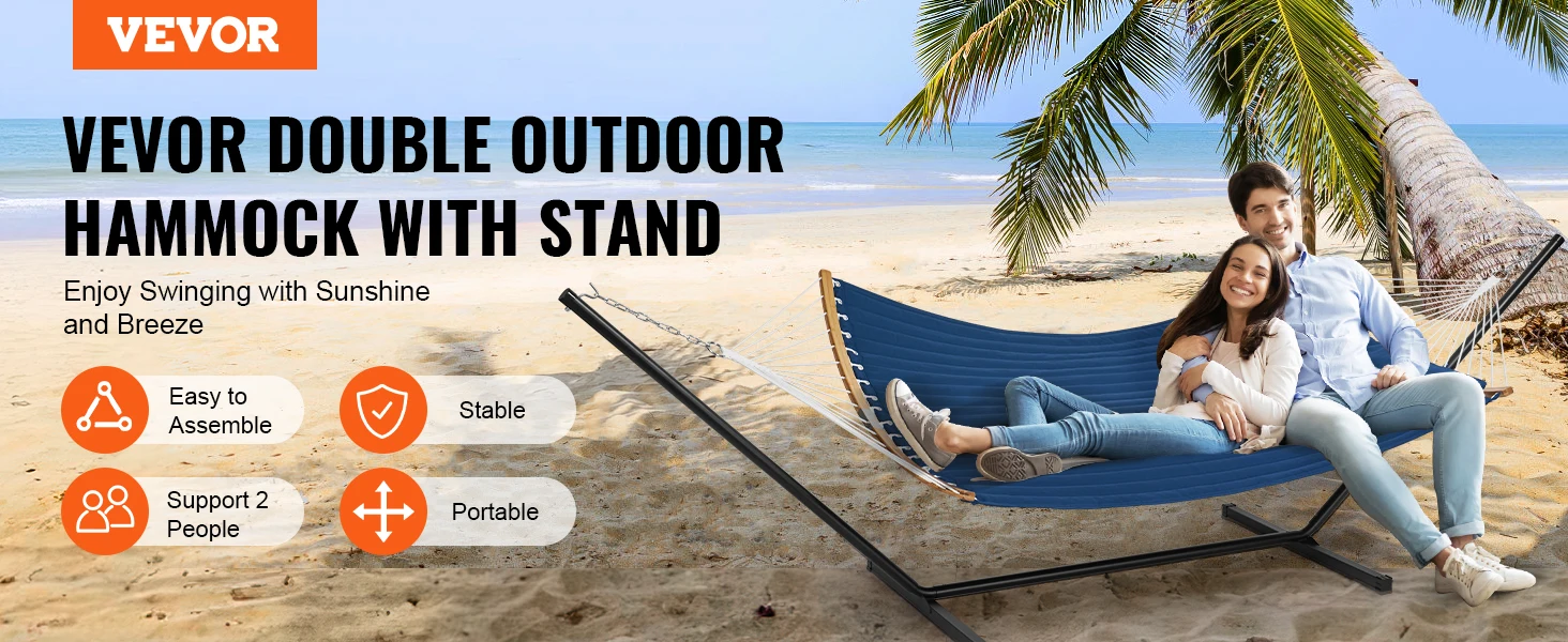 Indulge in ultimate outdoor relaxation with VEVOR's double quilted fabric hammock with stand. Crafted for lasting comfort and reliability, our hammock features 200g quilted cotton, reinforced ends, stable shaped steel stand, curved spreader bars and handwoven ropes, providing endless outdoor fun.