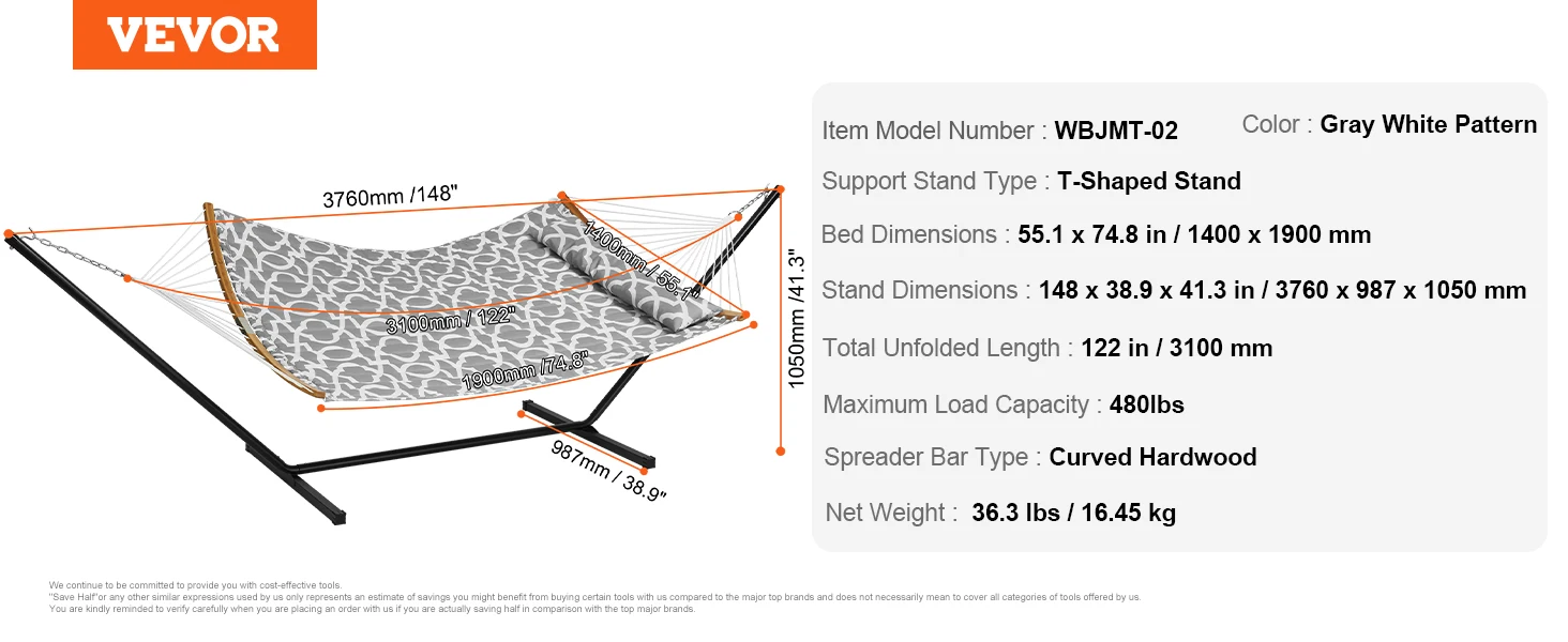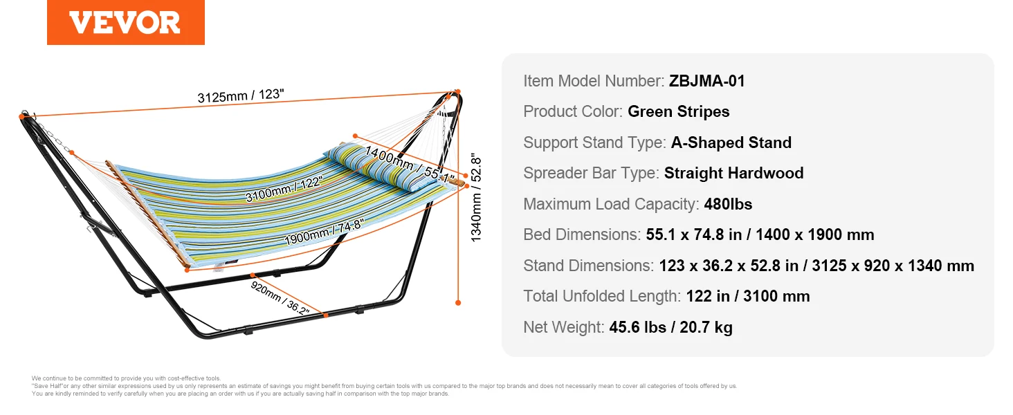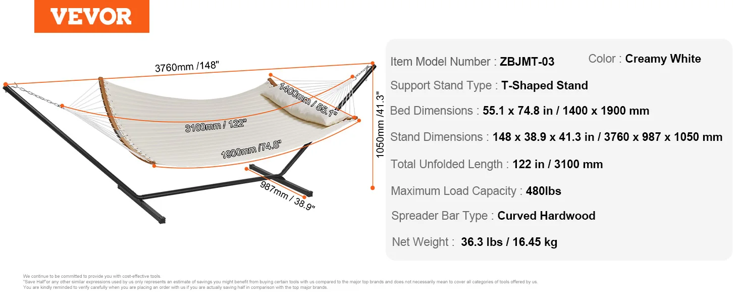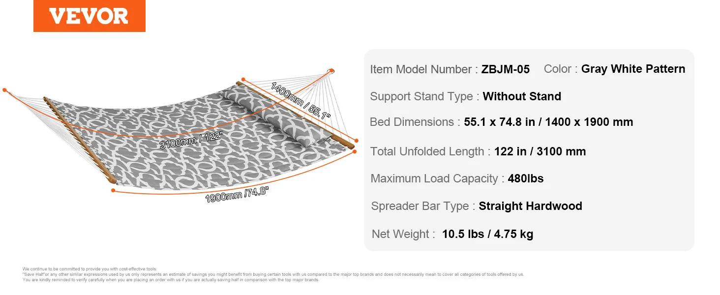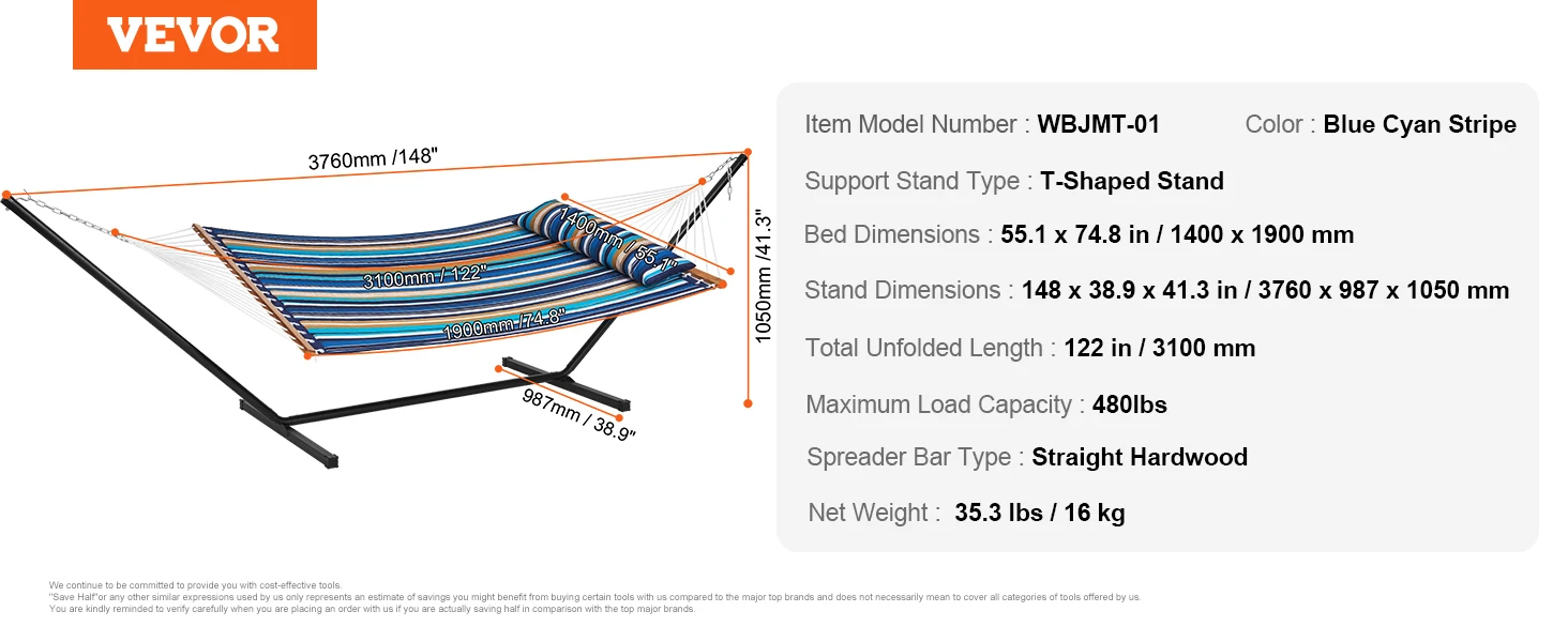 Indulge in ultimate outdoor relaxation with VEVOR's double quilted fabric hammock with stand. Crafted for lasting comfort and reliability, our hammock features 200g quilted cotton, reinforced ends, stable shaped steel stand, curved spreader bars and handwoven ropes, providing endless outdoor fun.