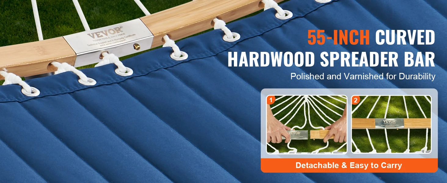 Versatile and Stylish: Our double quilted hammock with spreader bars offers a variety of colors and styles, making it perfect for your backyard, garden, patio, poolside, and more. Effortlessly set up and pack away, use it with trees or a hammock stand, and turn your place into a delightful retreat.