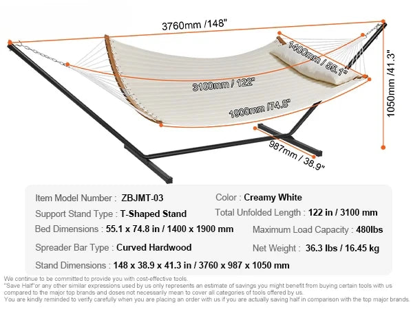 Ensuring stability and safety: Metal rings, fishtail knots, and two 14-inch galvanized chains secure your lounging experience, while a detachable soft pillow adds comfort. Metal hooks, a powder-coated steel stand, and bottom protective covers ensure durability and convenience.
